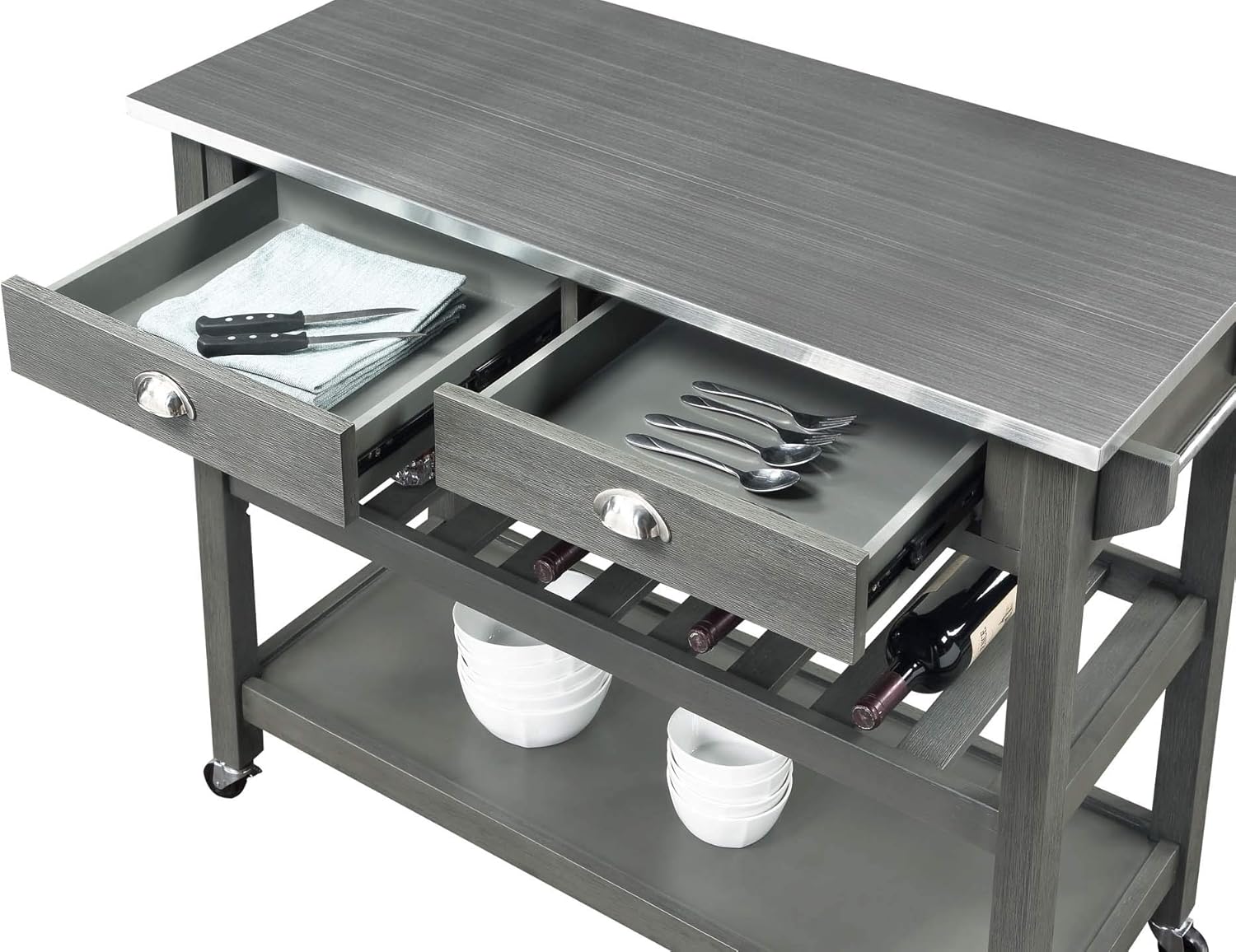 The American Heritage 3 Tier Stainless Steel Kitchen Cart with Drawers by Convenience Concepts is the perfect addition to any transitional kitchen space. Providing functionality and efficiency for everyday tasks, this classic unit is sure to become a staple in your home. The smooth steel countertop is an ideal efficient food prep station, and the stainless-steel towel rack allows for easy cleaning. Two additional shelves and two spacious drawers on smooth ball-bearing slides offer all the storage one may need. The middle shelf is slatted giving the perfect space to store wine bottles or other kitchenware as well. This finely crafted piece is perfect for small kitchens, apartments, and anywhere you need a little extra storage or kitchen prep space. This portable cart is the perfect mobile storage space thanks to the 360-degree swivel caster wheels, two of which are locking. Available in multiple finishes, you are sure to find an American Heritage 3 Tier Stainless Steel Kitchen Cart with Drawers by Convenience Concepts to match your current existing interiors. Please note that this cart is not intended to be used as a cutting board.