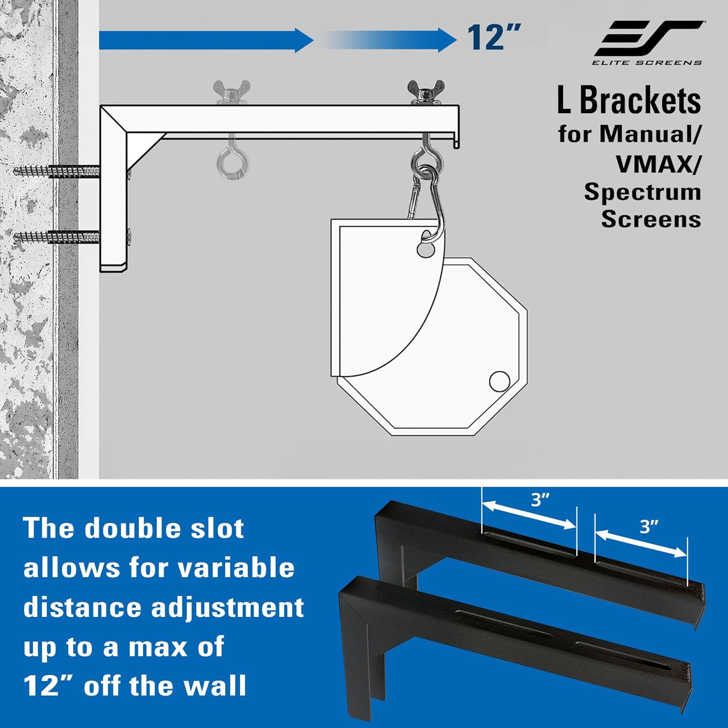 Elite Screens L-BracketsThe perfect accompaniment for any projection screenwhere direct flush wall or ceiling installation is not applicable.Elite Screens L-Brackets feature a robust metal construction, welded joints, and finished with durable paint.Additional Features:Easy, straight forward installation.Perfect for installations that require wall clearance, or ceiling height adjustmensts.Includes all installation hardware (skews, anchors, sliding adjustbale eye-screw and wingnuts, and carabiner clip ring)Made for Manual, Spectrum, Spectrum Tension, and VMAX2 series screens by Elite Screens, but can be used with most projection screens in the market today!Available in your choice of Black or White finish.Available in 6" or 12" lengths.Elite Screens is focused on providing the best quality products at affordable prices all while continueing to offer exceptional customer service.Since 2004, Elite Screens has become the #1 global leader in projection screen manufacturing through its headquarters in Garden Grove, Californa andinternational branch offices in Europe, Japan, Australia, India, Taiwan, and China. Elite Screens is dedicated to making projection screens for everycustomer and for any projection environment, from camping, gaming, and classrooms, to backyard theaters, wedding/ family reunion halls and everything in between. All of Elite. industry. Non-Profit, Religious, and Government Organizations.
