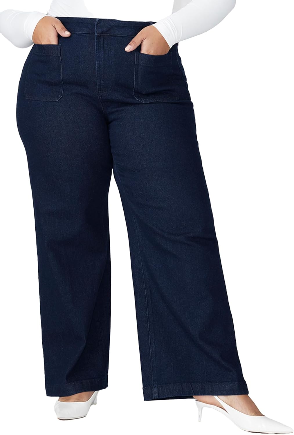 These close-fit, high-rise wide leg denim pants are designed with a front fly zipper and hook and bar, featuring patch and functional welt pockets, and crafted from mid-stretch denim to offer a structured yet flattering silhouette.