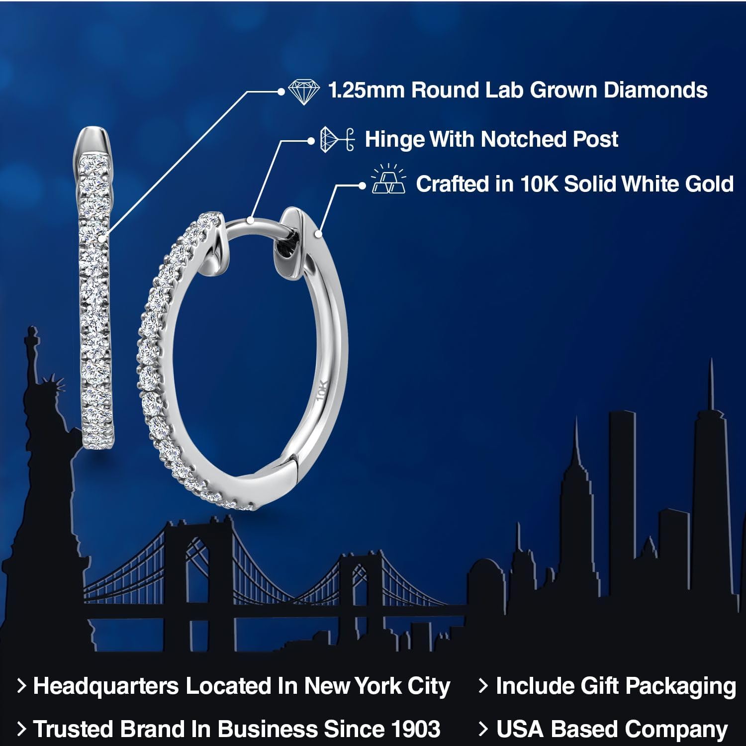 Illuminate every moment with the refined radiance of these 10K White Gold Lab Grown Diamond Hoop Earrings, an exquisite expression of timeless elegance and modern sophistication. Thoughtfully crafted to capture both luxury and conscience, these diamond hoop earrings for women blend classic charm with contemporary beauty. Each hoop features a graceful curve adorned with 0.25 carat total weight of sparkling lab grown diamonds, meticulously set to highlight their stunning G-H color and VS-SI clarity. The result is a luminous dance of light that complements both everyday styling and special occasions, from an intimate dinner to a memorable celebration. These lab grown diamond hoop earrings are delicately fashioned from solid 10K white gold, offering lasting brilliance and refined versatility. Their sleek 18mm silhouette, just under 1 inch, gracefully hugs the ear for a polished yet comfortable fit, making them ideal for all-day wear or an unforgettable evening statement. Whether given as a cherished anniversary keepsake or tucked into a stocking as a refined holiday gift, they bring joy that sparkles long after the season ends. A perfect stocking stuffer for mom, a sentimental holiday gift for your partner, or a beautiful way to say "I love you" to a dear friend, these white gold diamond hoop earrings embrace the essence of giving and elegance in one enduring design. Surprising yet classic, radiant yet subtle, this piece makes every moment feel like it belongs in a love story. Add brilliance to your jewelry collection or delight someone special with one of the best gift ideas for a woman who has everything. Make holiday mornings unforgettable with the enduring warmth and shimmer of these lab grown diamond earrings in white gold.This beautiful item is brand new and comes with complimentary gift packaging appropriately selected to match the item you purchased. The packaging ranges from dainty foam insert packaging to luxurious leather insert wood. This