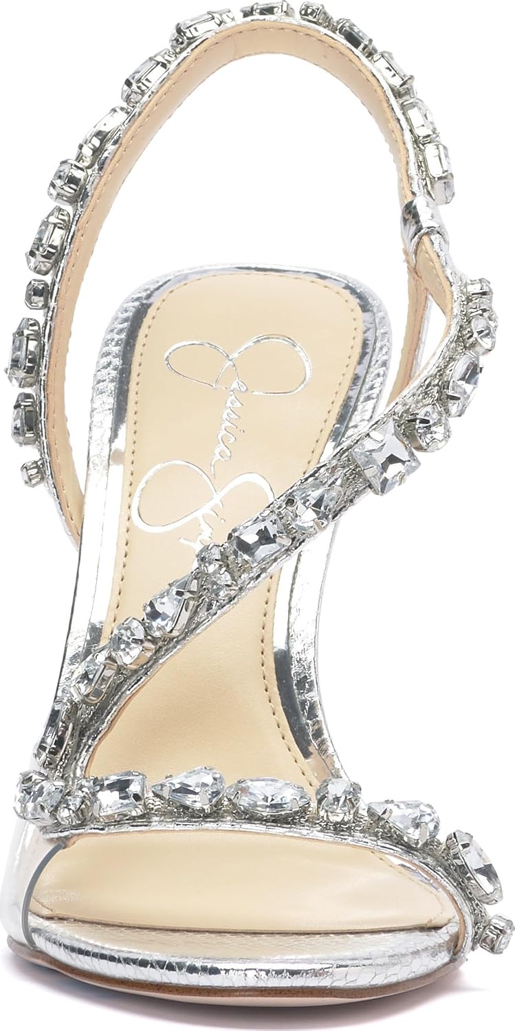 Step into effortless glamour with the Jessica Simpson Jaycin high heel sandal, designed for women who appreciate modern style with a touch of sparkle. This elevated style features dual-tone rhinestones along the asymmetrical straps, adding eye-catching shine. With a stylish 3.75 inch stiletto heel and an open almond toe, the Jaycin offers a balance of elegance and wearability, making it ideal for weddings, parties, and special events.The elastic slingback strap ensures a flattering fit. You can confidently choose to size up by 1/2 for an ideal fit. Make the Jessica Simpson Jaycin high heel sandal your go-to choice for any event, from elegant gatherings to casual nights out, and enjoy the perfect fusion of sophistication and practicality in your shoe collection. Embrace your fashion-forward side with these sparkly heels designed for the woman who loves to shine and stand out effortlessly!