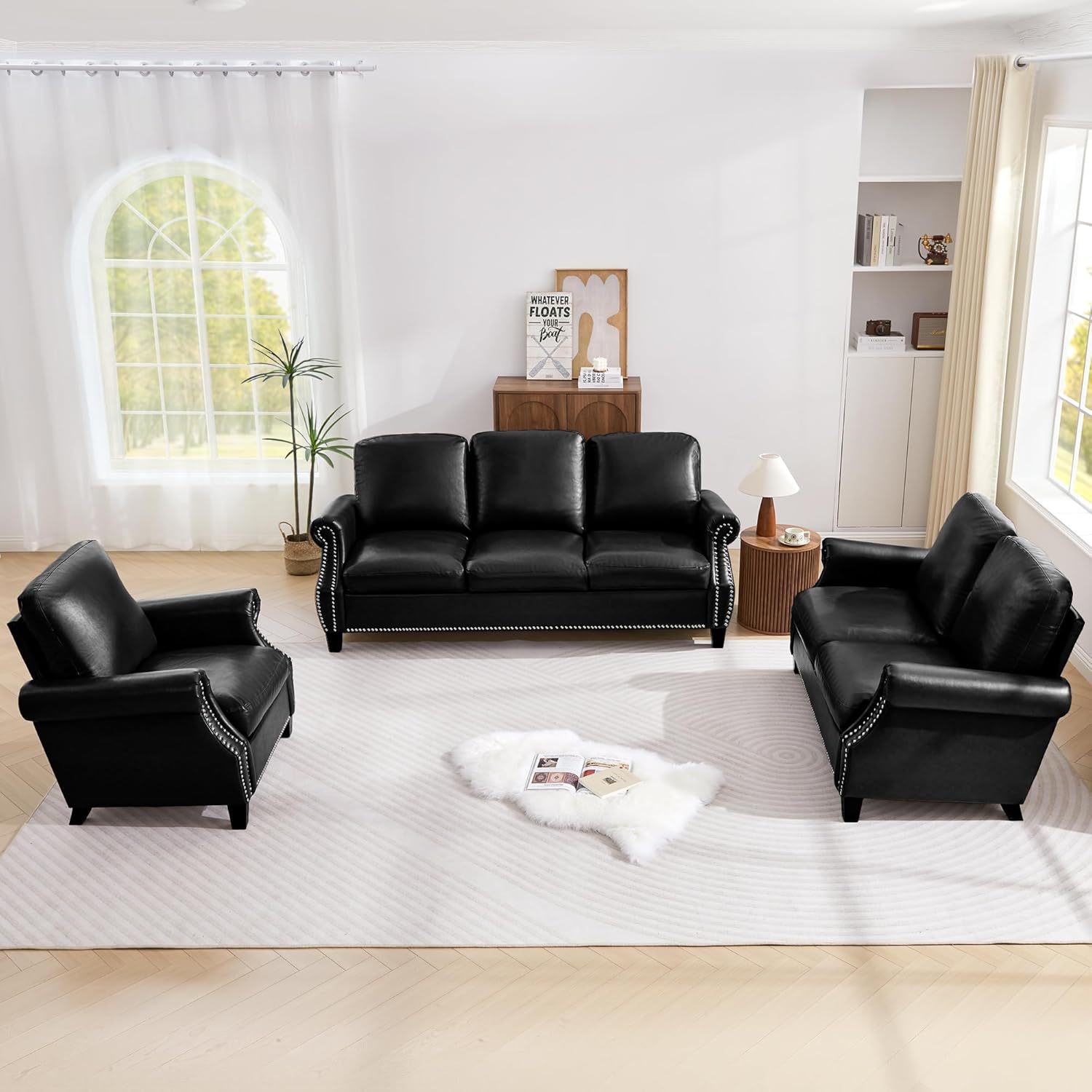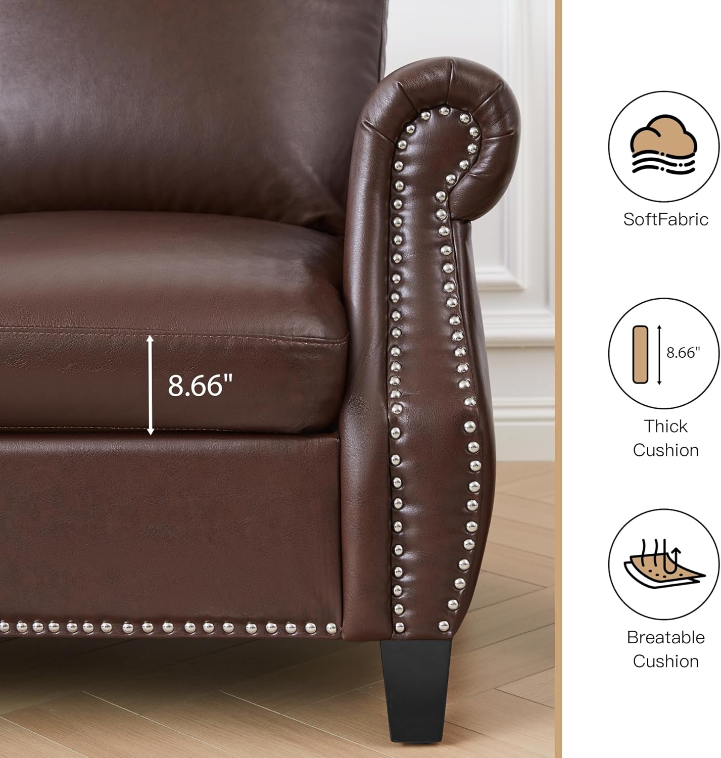 | Additional Features | Classic Nailhead Trim, Comfortable Cushioned Seating, Compact Design for Small Spaces, Durable PU Leather Upholstery, Easy Assembly, Ships in 3 Packages |