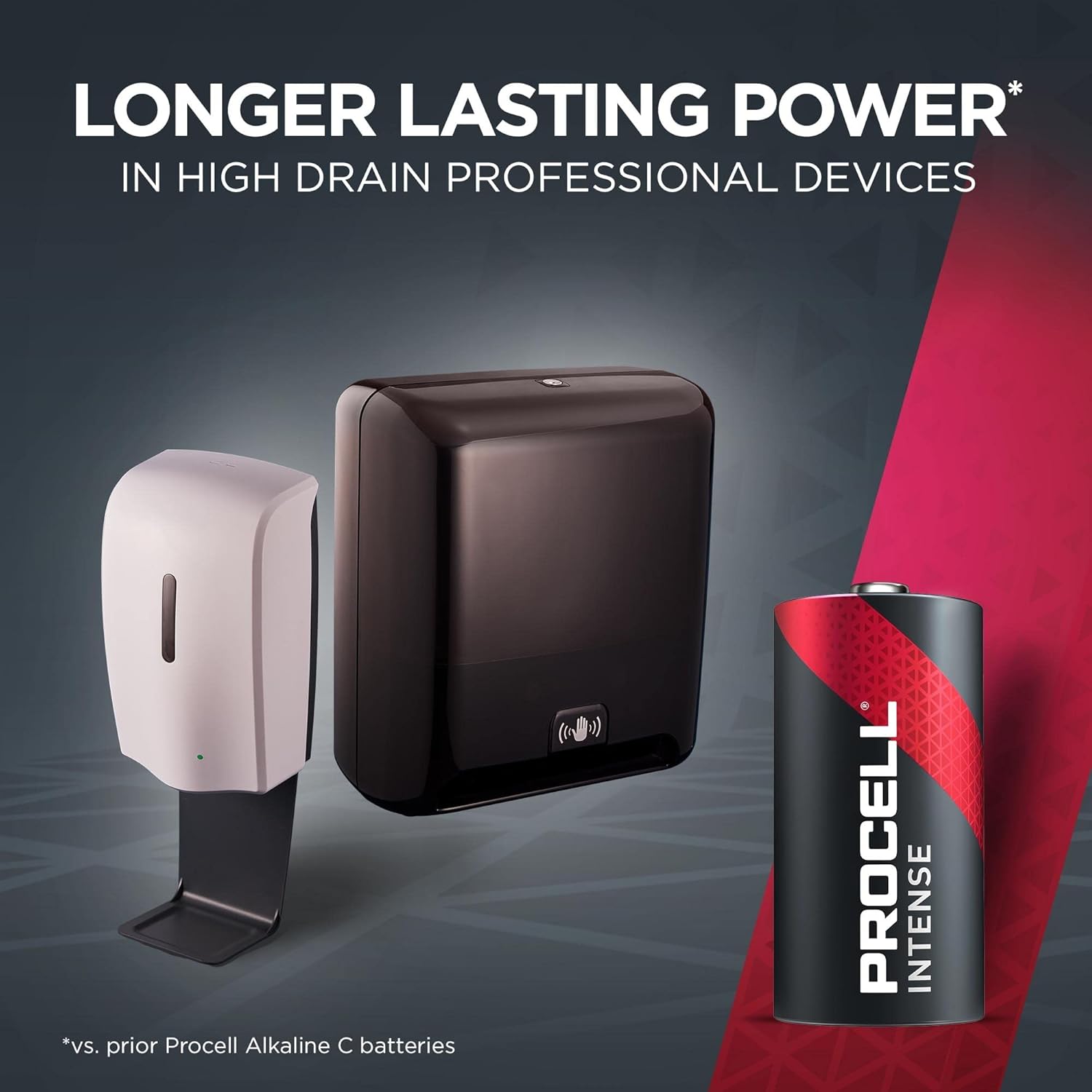 Procell Alkaline Intense C industrial batteries are ideal for powering high drain professional devices which require a high amount of power or peaks of power, such as paper towel dispensers, soap dispensers, automatic odorizers, flashlights, and more. Guaranteed 10 years in storage. Delivers longer lasting power (vs. prior Procell Alkaline C batteries) in high drain professional devices that may result in fewer battery replacements and can lead to savings on operating costs associated with battery replacement. Operating temperatures from -4°F to 129.2°F. You can use up to 30% fewer batteries by switching to Procell Intense for high drain devices (estimated savings versus relevant competition). Manufactured using superior cell design (vs. prior Procell Alkaline C batteries) to ensure high-quality cell construction. Economically packaged in bulk. Available in AA, AAA, 9V, C, and D sizes.
