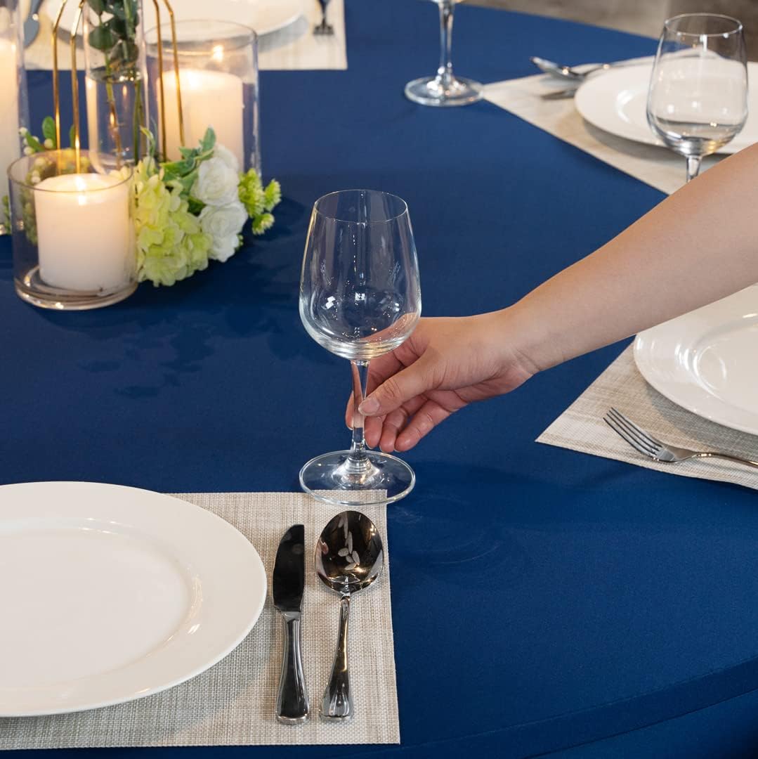 Give your tables an elegant look with our Table Tek Round Blue Spandex Table Cover. This stretchy table cover fits tables that measure 72 inches in diameter and 30-inches in height. Crafted from a blend of spandex and polyester, this stretch fabric table cover is durable, making them great for everyday use at your establishment. Built with foot pockets, this round tablecloth fits onto your table legs to keep them in place on a windy day. This wedding tablecloth is wrinkle-resistant so you can spend less time ironing and more time decorating tables. To protect from unsightly smudges, this dining table cover is stain-resistant. Designed with a contour cut, this spandex tablecloth elevates the appearance of your grazing tables. For a quick cleanup after use, this fitted table cover can be laundered in cold water with the gentle cycle and hung to dry. To maintain its high-quality appearance, this elastic tablecloth can not be cleaned with bleach. This cover for tablecloths measures 72 inches in diameter. Sold in a 1 count box.
