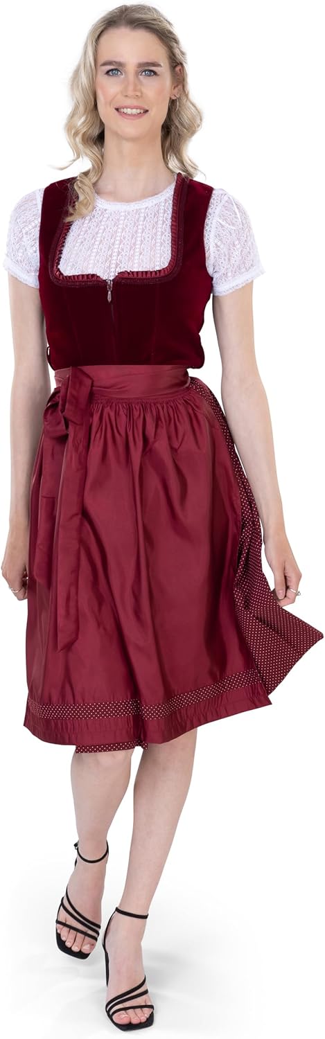 BORDEAUX VELVET DIRNDL - ELEGANT & TRADITIONAL: The Katharina dirndl is the perfect choice for those who love the traditional charm of Oktoberfest, Bavarian, or Alpine styles, while also appreciating classic elegance. Its balcony neckline, adorned with delicate edging, makes this authentic dirndl a true standout. The set includes both the dirndl and apron. EXCLUSIVE HANDMADE DIRNDL: Crafted from luxurious red velvet, the dirndl and apron are made with premium materials and meticulous attention to detail. The neckline features a high-quality Froschgoscherl ruffle and finely pleated detailing. TRADITIONAL MIDI DIRNDL - PERFECT FIT: The Katharina dirndl is designed for a flattering fit, with a skirt length of approximately 25 inches, falling around knee height. The front zipper is both functional and discreet, ensuring a seamless look. The comfortable velvet fabric offers a beautiful, body-hugging fit, making this dirndl ideal for folk festivals, Oktoberfest, casual outings, or special occasions like weddings. product fit: The Dirndldress is a normal fit. p> size table: Size US:0 (EU:32) Size US:2 (EU:34)Size US:4 (EU:36)Size US:6 (EU:38)Size US:8 (EU:40) Size US:10 (EU:42)Size US:12 (EU:44)