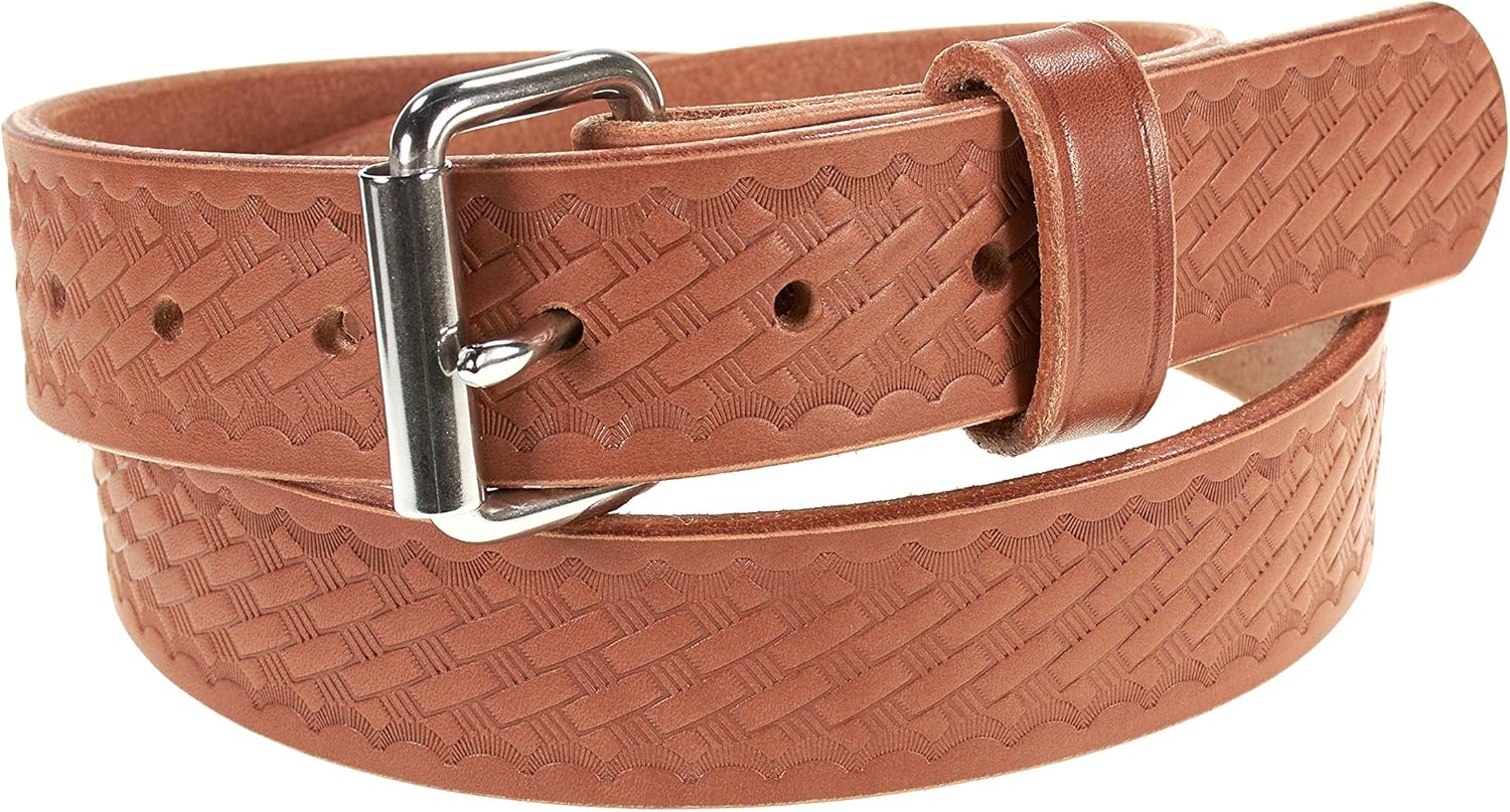 Thick Heavy-Duty Leather Belts - American Handmade by Amish CraftsmanFull Grain 14 oz. Bull/Cow Hide Leather - ONE SOLID PIECEBasket Weave Embossed.Heavy Duty Stainless Roller Buckle. Easily change out buckle for your own Personal Buckle. 1.5" WIDE - NO SAG, ROLL OVER, OR STRETCHING GuaranteedBelt is made to last a Lifetime of use and abuse.Sizes available: 30" to 60" in length.How to measure your size:If you have an old belt, measure the leather part of the belt from where it attaches to the buckle to the hole you normally buckle your belt.A General rule is to order a belt 3" to 4" larger than your pants size.You can also measure your waist and purchase a belt of your waist size.On odd number measurements, purchase a belt the next size up.