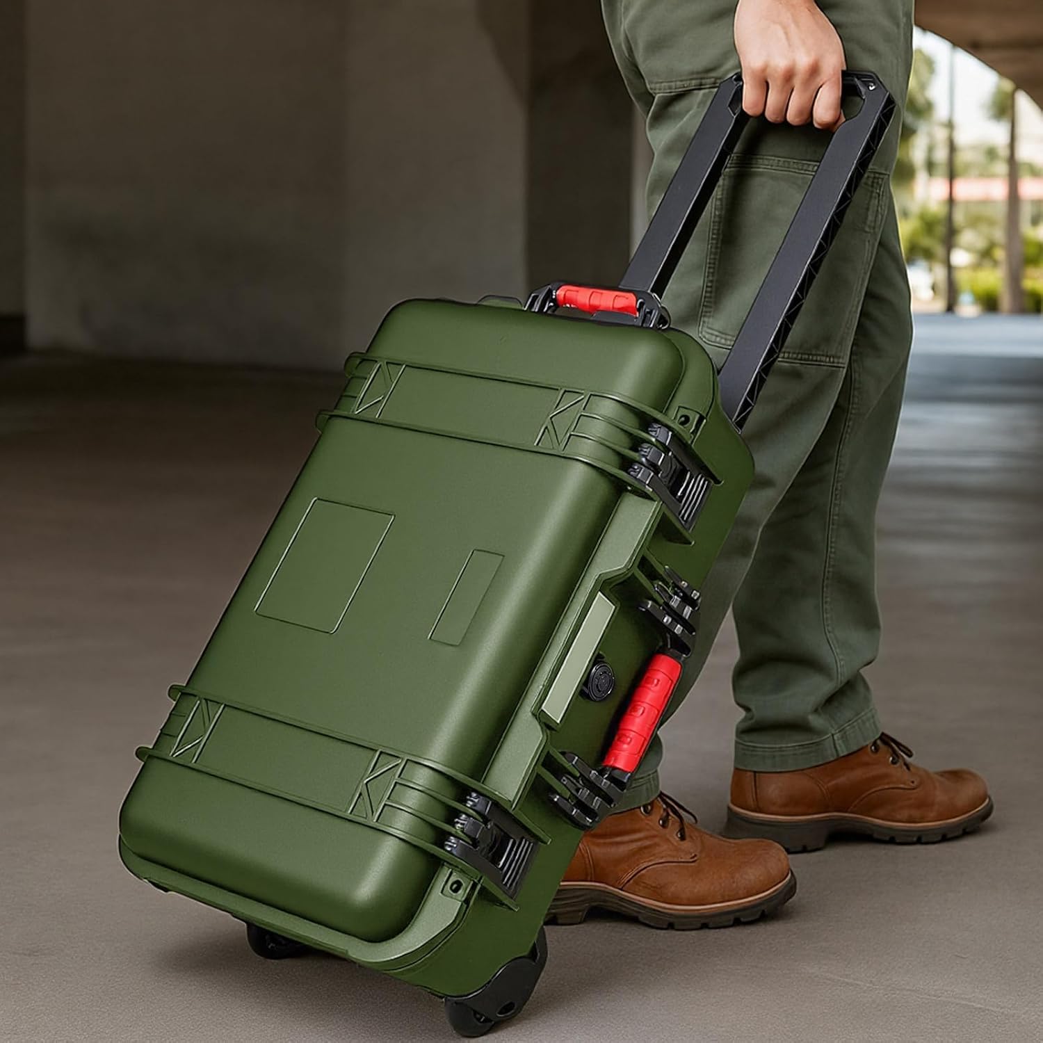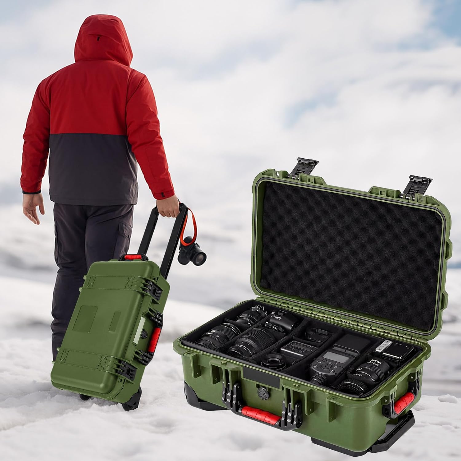 Features: Adjustable foam compartments fit camera, drones, lenses, and gear perfectly Protects cameras, drones, tools, or sensitive electronics from drops, shocks, and weather. Specifications: Material: resin Color: military green Size: External dimensions: about 22.05 x 13.98 x 9.06 inch Internal dimensions: about 20.28 x 11.42 x 7.68 inch Package includes: 1 x Camera hard case Notes: Manual measurement, please allow slight errors on size. The color may exist a slight difference due to different screen displays.