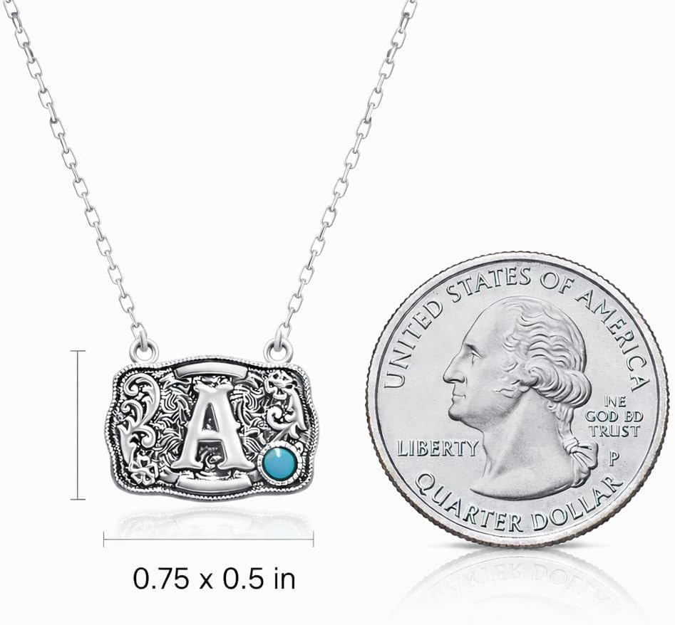 Bring out your inner cowgirl with this gorgeous 925 sterling silver initial necklace, crafted to reflect the beauty and strength of Western women. The bold belt-buckle pendant showcases your engraved initial against a detailed Western backdrop, while a genuine 3mm Kingman turquoise stone adds that perfect pop of Southwestern color. A sweet 925-stamped silver heart charm brings a feminine touch, and the softly burnished finish gives the whole piece a vintage, worn-in look you’ll love. Designed for everyday comfort, this lightweight 5g necklace features a 19-inch chain with a 1.5-inch extender—ideal for layering or wearing solo. It’s rust-resistant, water-safe, and gentle on the skin, making it as durable as it is stylish. Crafted with care and Western pride, this necklace is the perfect accessory for women who live the lifestyle and love the legacy.