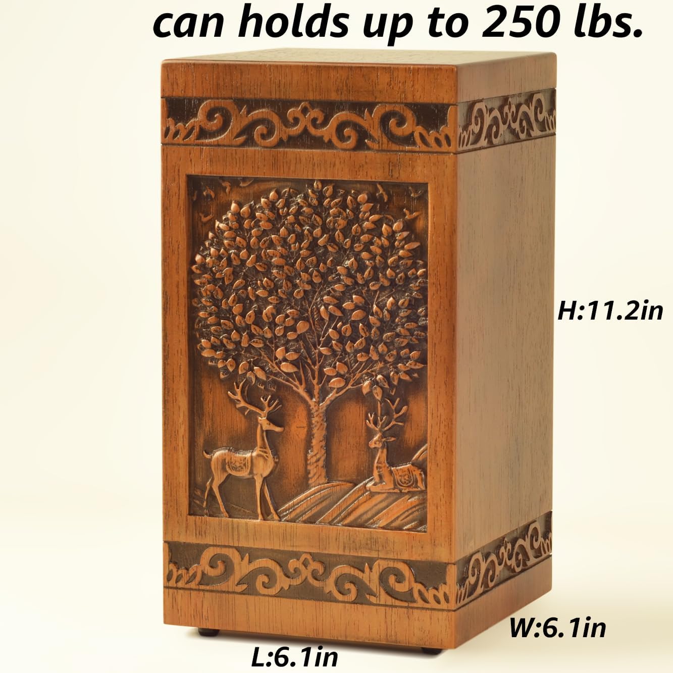 Honor the life of a loved one with this exquisite wooden cremation urn. Crafted from high-quality wood, this urn features an intricate Tree and deer design, adding a touch of natural beauty to the memorial. Designed to accommodate up to 250 lbs, this large urn is suitable for adult remains, providing a dignified and respectful resting place. The urn's spacious interior ensures ample space, while the sleek exterior offers a timeless aesthetic. Whether for a male or female, this urn serves as a poignant tribute to cherished memories. Embrace the warmth and elegance of this wooden cremation urn as you commemorate a life well-lived.