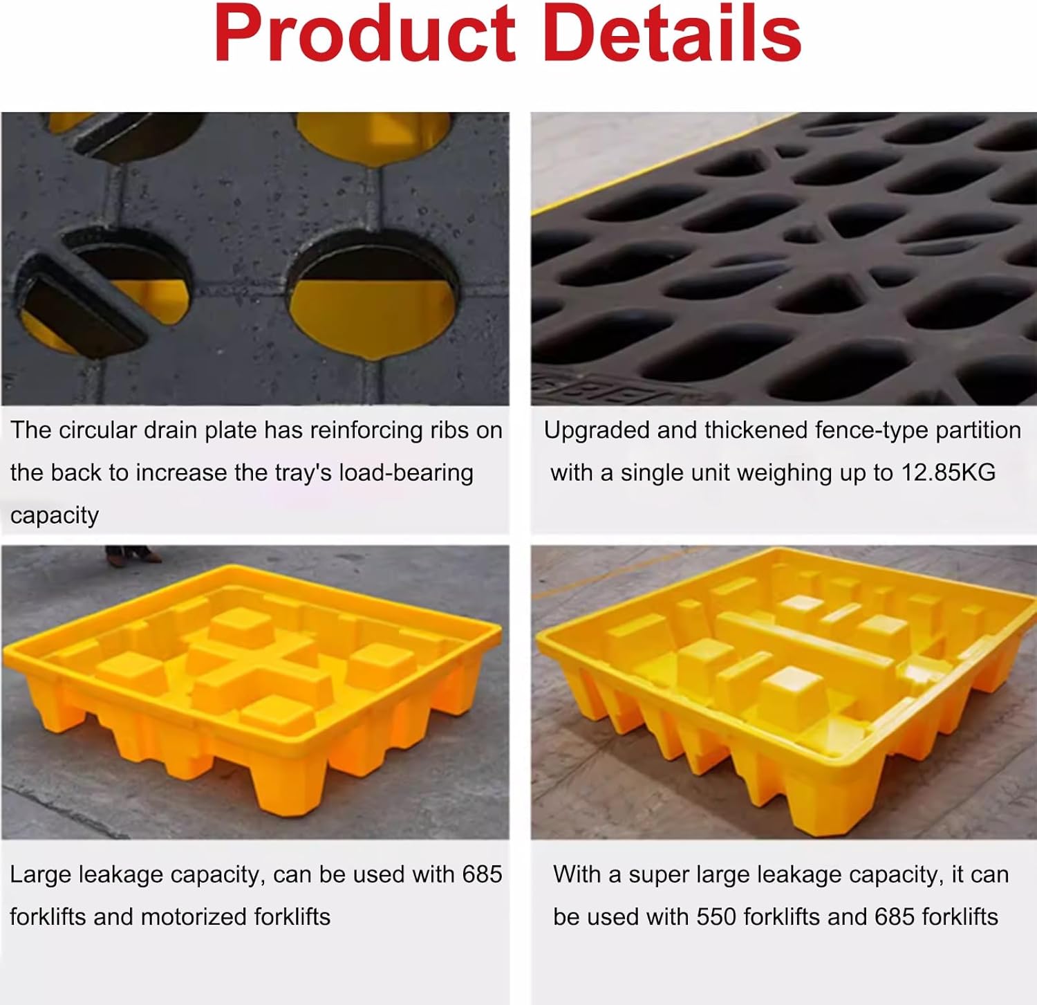 PRODUCT FEATURES:Easy loading and unloading, these platforms include drain outlets for efficient liquid collection or drainage.Their detachable design simplifies cleaning, ensuring a consistently clean workspacePRODUCT PARAMETERS:Product name: Low Profile Spill Containment PalletMaterial: Polyethylene (HDPE)Color: Yellow + BlackProduct size/Load/Leakage: (L x W x H)49x36x10cm, Static load 700kg, leakage 43L;Production: Thickened design, strong load-bearing, durable, wear-resistant and fall-resistantApplicable scene: Warehouse, workshop, maintenance, supermarket, industrial, commercial, factoryEasy to clean: Rinse with clean waterPACKAGE CONTENT:1PCS x Leak-Proof TrayNote:1. Please measure the required size2. stack the goods evenly to ensure the load-bearing of the pallet, fully distribute the weight and prolong the service life.
